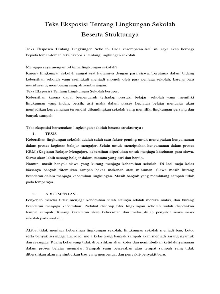 Teks ini juga disebut sebagai tulisan yang berusaha menerangkan atau menguraikan suatu pokok pikiran untuk disampaikan kepada pembaca. Baca juga artikel terkait tentang materi: Membuang sampah sembarangan telah menjadi kebiasaan buruk masyarakat indonesia. Hal itu terjadi karena kurangnya kesadaran dan rasa tanggung. 20.12.2020 · berikut contoh teks deskripsi tentang alam: Terdapat kawah di tengah gunung ini. Untuk mendaki gunung dan melihat kawah, … Gunung bromo merupakan salah satu gunung yang menjadi tujuan wisata alam favorit di jawa timur. 4 contoh teks eksposisi proses makanan, puding dan batik 7 contoh teks eksposisi perbandingan beserta strukturnya 3 contoh teks eksposisi tentang internet yang populer Untuk lebih memahaminya, disini kita akan memberikan beberapa contoh agar anda tidak keliru serta dapat membedakannya terhadap jenis teks yang lainnya. Pengertian, ciri ciri, pola juga manfaat. 29.08.2021 · contoh teks prosedur misalnya prosedur keselamatan kerja, prosedur dalam menggunakan suatu benda, dll. Jawab dari masing masing individu terhadap kebersihan lingkungan.